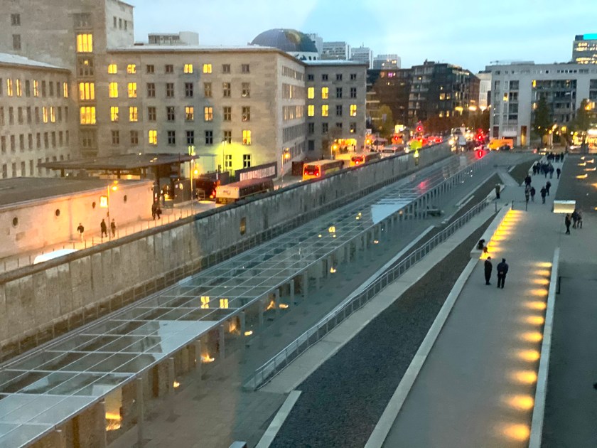 View of the remnants of the Berlin Wall and entrance to the former Gestapo headquarters from the window of The Watchtower art installation.