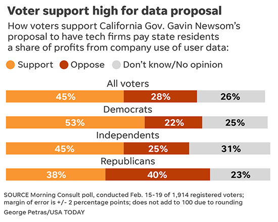 The article commissioned original research showing that 45% of Californians already support getting “a share of profits from company use of user data.” Fully 26% were undecided and probably needed more specifics before deciding. And it’s fair to assume the 28% against the idea assumed the worst given current industry practices – that their private data would be sold to the highest bidder (which is not the case).